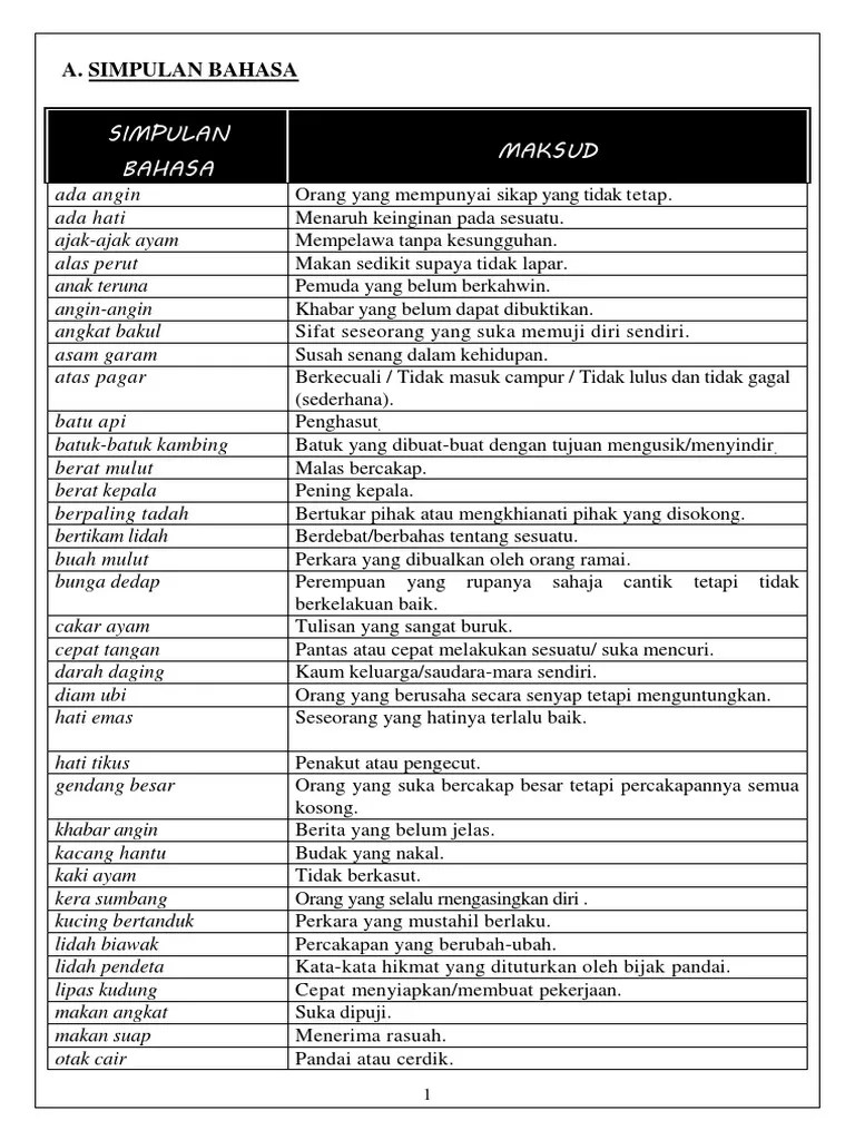 Senarai simpulan bahasa beserta dengan maksudnya adalah seperti yang berikut: